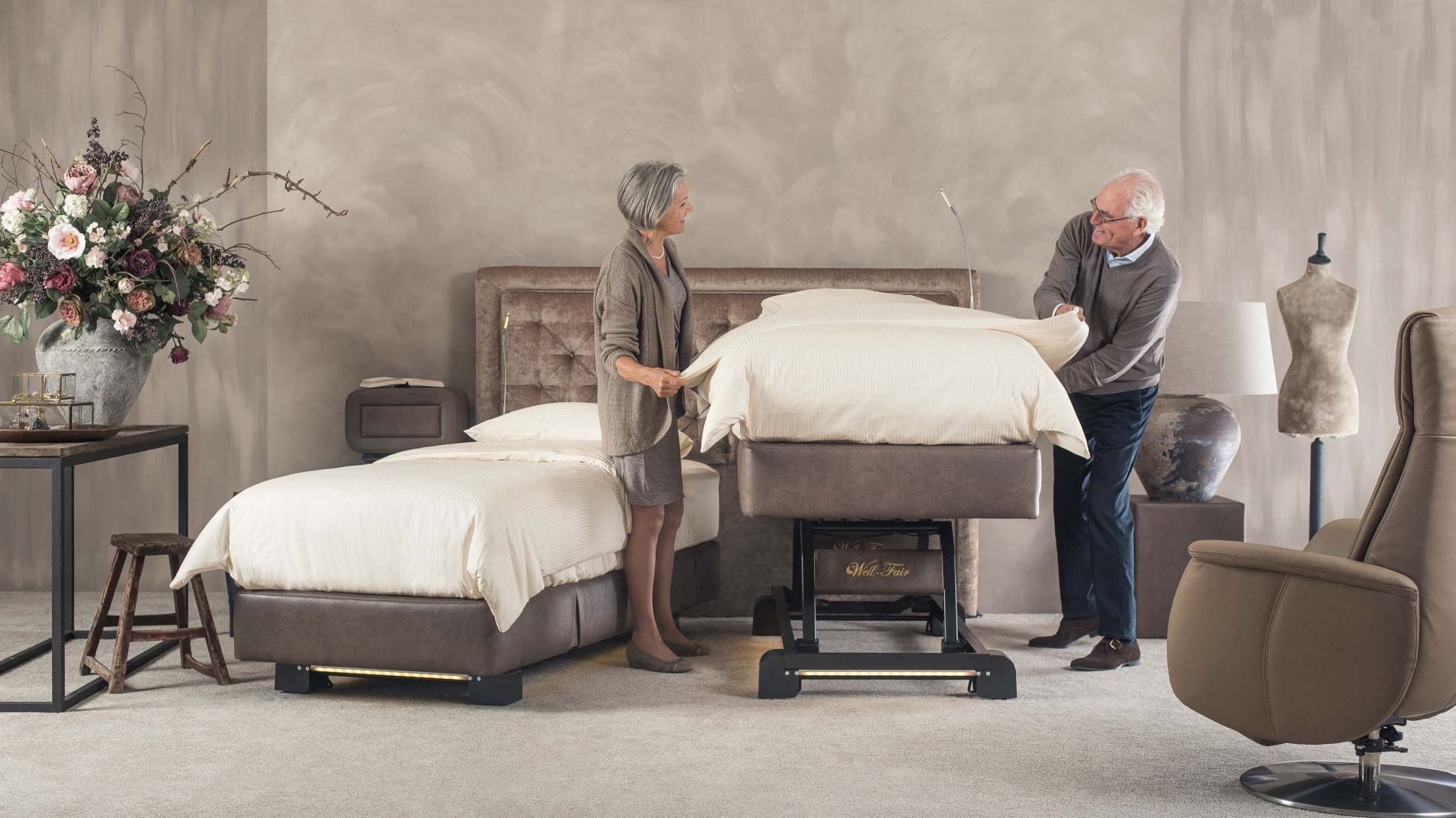 De Well-Fair boxspring is altijd voorzien van wieltjes. Daardoor is het eenvoudig om de bedden uit elkaar te rijden. Ook zijn de wieltjes voorzien van een rem zodat ongewenst wegrijden wordt voorkomen. U ziet op de onderstaande afbeelding hoe eenvoudig het bed op te maken is dankzij de hoog-laag functie in de boxspring.